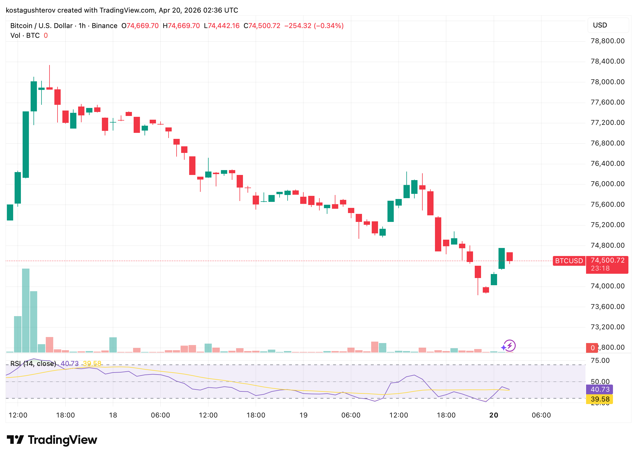 The 1-hour chart tells the story cleanly. BTC reached on April 18 near $78,000, then spent the following 72 hours in a steady, low-volume bleed that brought price to $74,500 by early April 20.