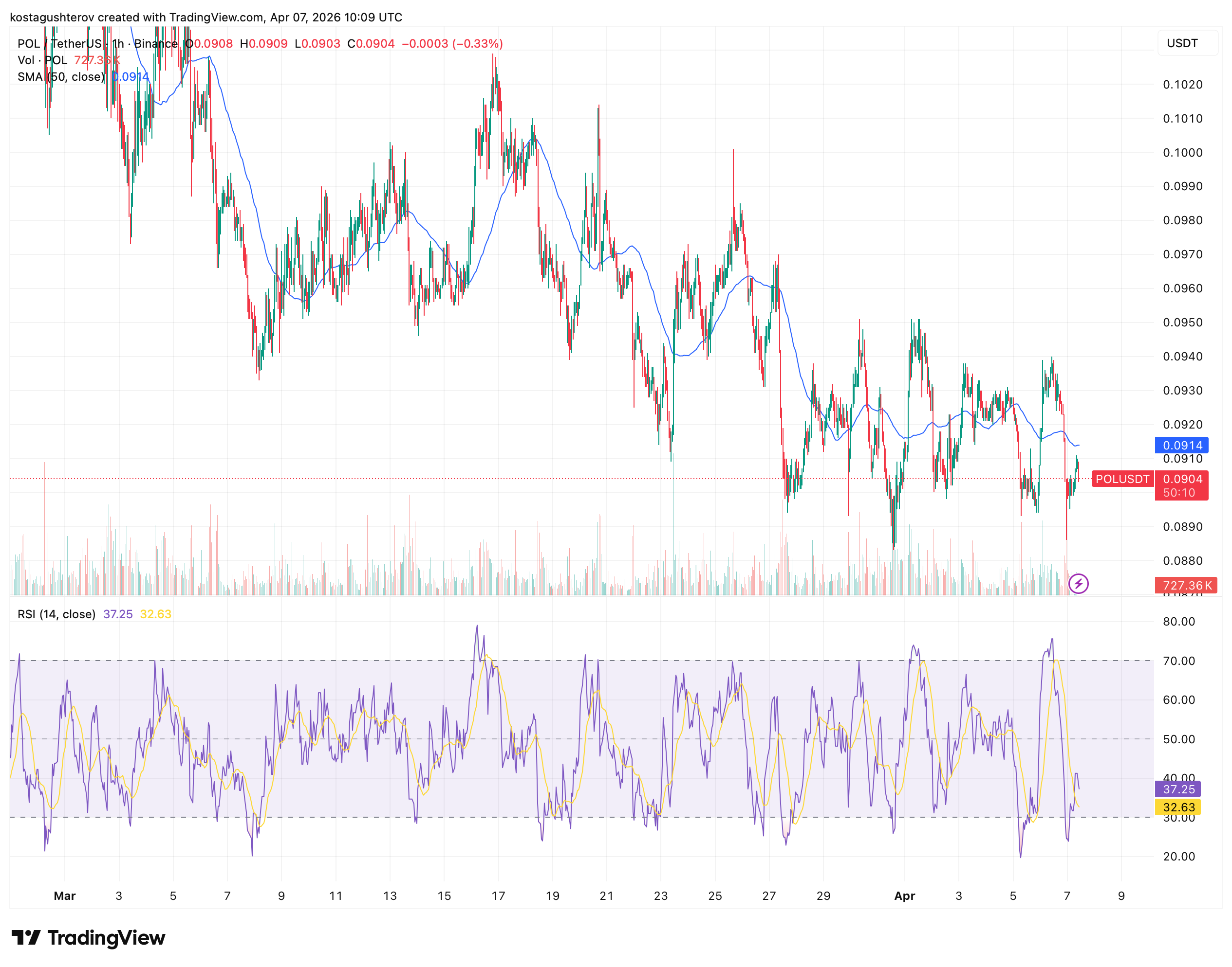 Faster finality and cleaner fee infrastructure address the two friction points that have historically pushed high-frequency DeFi developers toward competing chains. The upgrade is a direct competitive response to that pressure. The market has not acknowledged it, POL has been in a consistent downtrend since early March, falling from $0.102 to $0.0904, with RSI at 32.63 approaching oversold and the 50 SMA sitting above price as resistance.