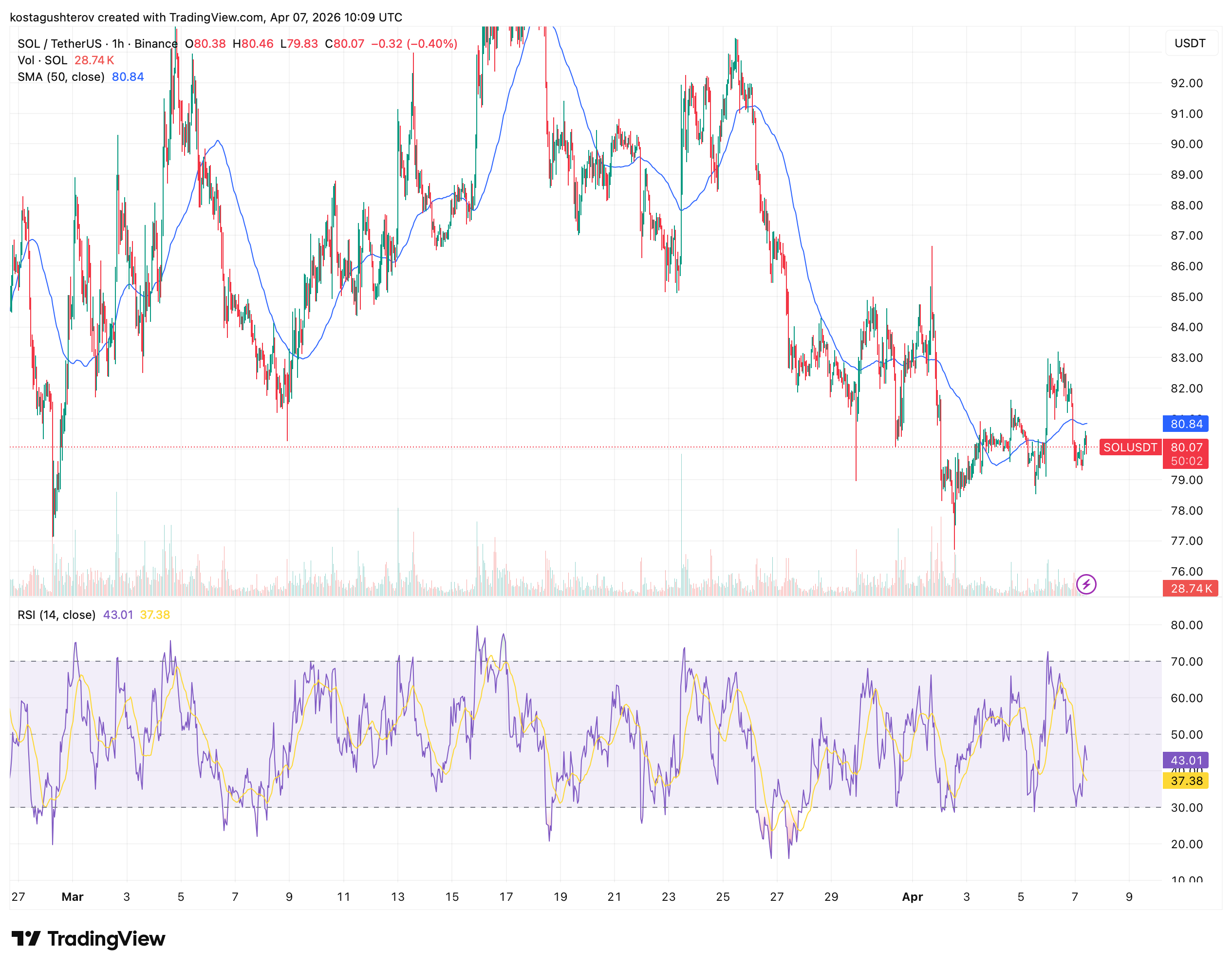 SOL’s price reflects the latter group’s priorities right now. At $80.07, it sits just below the 50 SMA at $80.84 at the upper edge of the $78–$82 support zone analysts identify as the current floor.