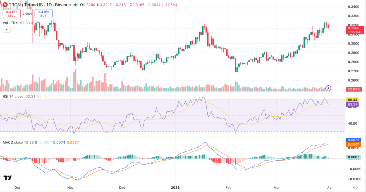 The technical picture on TRX/USDT adds context to the macro story. Trading around $0.3166 on the daily, TRX has recovered sharply from the $0.24–$0.27 range it occupied through October and November 2025.