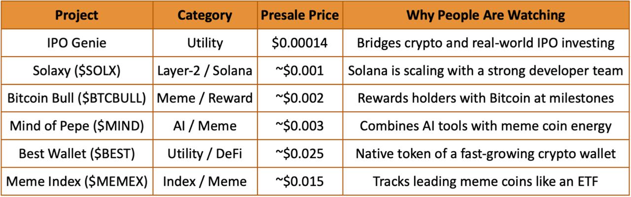 The table below presents six projects currently in presale phases. Data was sourced from each project’s public website. No ranking is implied.