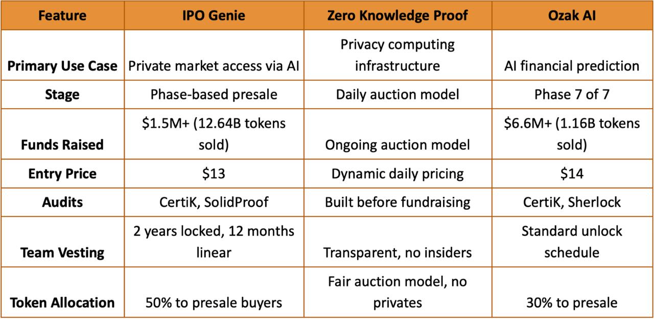 IPO Genie, ZKP, and Ozak AI each take different approaches: IPO Genie favors early buyers with 50% presale allocation and bonuses; ZKP uses an auction model to reduce insider advantages; Ozak AI is in late presale stages at higher prices.
