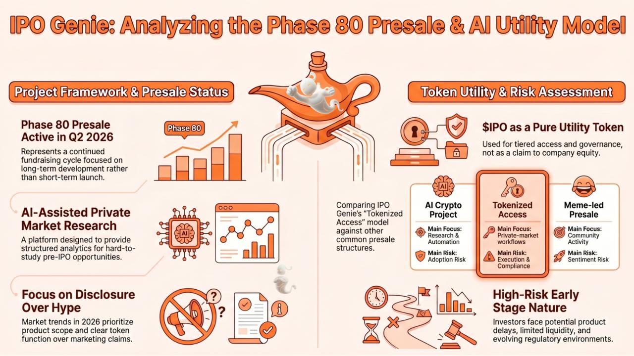 Within that setting, IPO Genie continued its presale activity into Phase 80 during Q2 2026. The project is presented as an AI-assisted research and analytics platform focused on private-market and pre-IPO access. Its token, $IPO, is described as a utility token tied to platform participation, tiered access, governance, and related features.