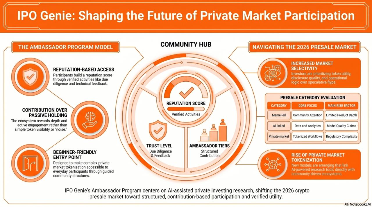 Crypto presales in 2026 are being reviewed with greater caution. Market participants are placing more weight on token utility, disclosure quality, and operational structure. Within that setting, IPO Genie ($IPO) has launched a new Ambassador Program through its Community Hub. The program is presented as a framework for structured participation, verified contribution, and broader global community growth around the project’s private-market access model.