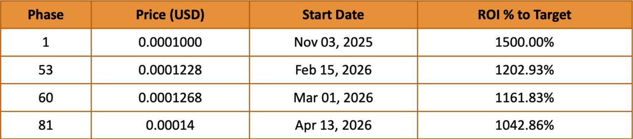 Each phase lasts approximately two days, with price increments between phases. This progression reflects the presale’s operational timeline through April 2026. Historical progression does not indicate future performance or guarantee that subsequent phases will proceed as scheduled.